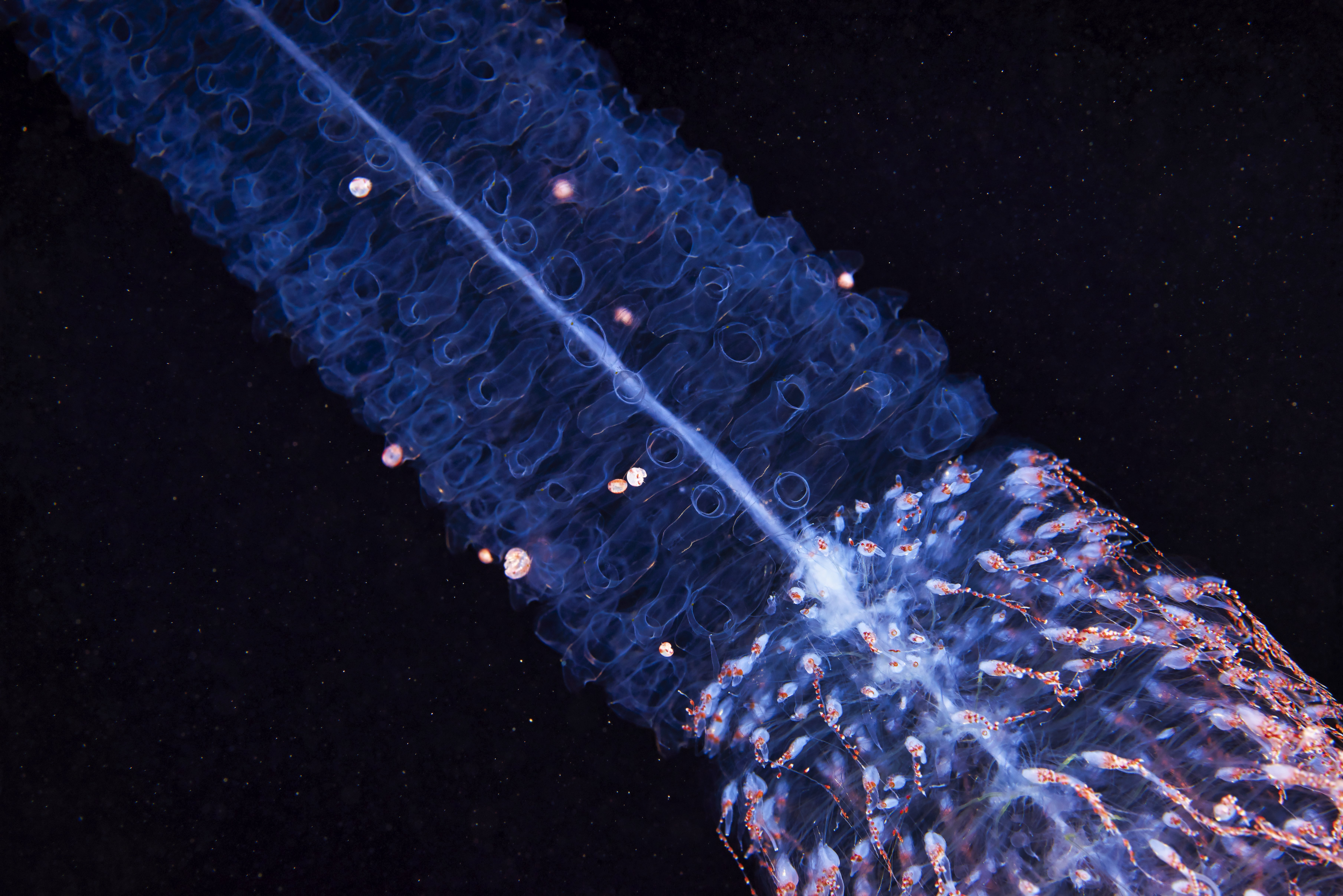 Het lijkt maar 1 dier te zijn, maar in het echt bestaat deze buiskwal uit een hele grote hoeveelheid diertjes, die kwal of poliepvormig zijn en elkaar vasthouden.